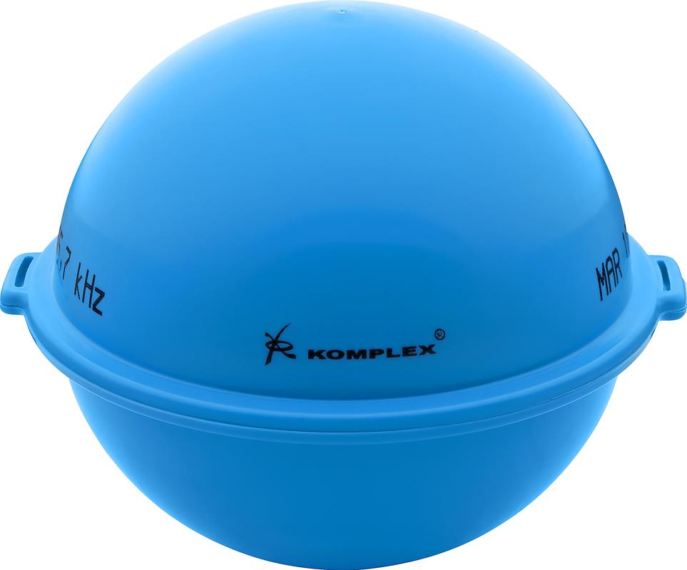 Elektryczny kulisty marker MAR 100-3D - niebieski firmy KOMPLEX, służący do oznaczenia kluczowych punktów na znakowanej trasie wodociągu, takich jak np. Punkt przecięcia z inną linią podziemną, Miejsce zmiany kierunku trasy ciągu lub inne ważne miejsce na trasie ciągu.